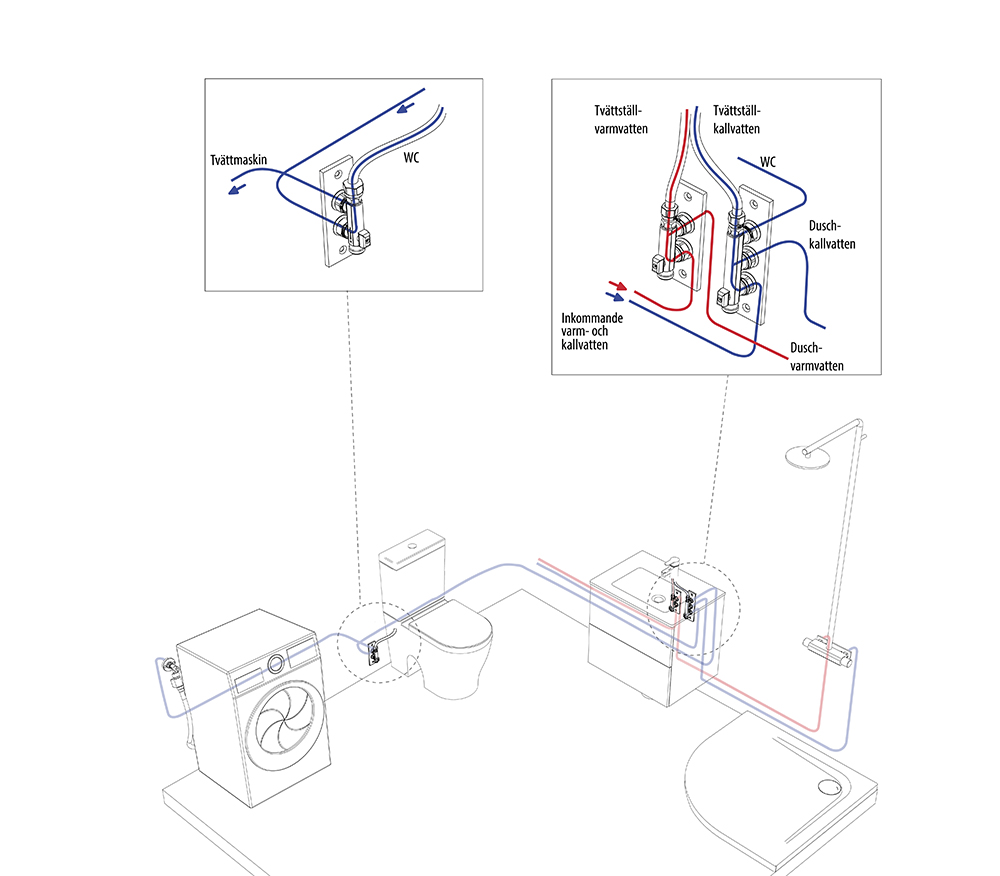 Hur leder man vatten smidigast i ett badrum med dold rördragning? Installationsmetoden med väggmonterade fördelare är fullt godkänd för våtutrymmen enligt Boverkets byggregler. Metoden har utvecklats för att minska vattenskadorna i våra hus. Vattenskador som kostar försäkringbolagen många miljarder varje år och drabbar oss själva i förlängningen med höjda premier. De svåraste vattenskadorna orsakas av de osynliga läckagen som pågår under en längre tid och sker innanför vägg. För att komma åt problematiken har ett regelverk kring installationen skapats, så att läckage ska vara enkelt att upptäcka.