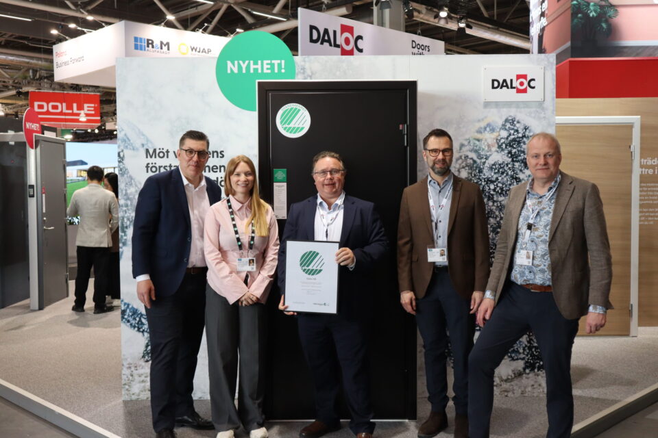 Daloc tog emot licensbeviset för Svanenmärkningen under Nordbygg. Från Miljömärkning Sverige: Lukas Sjölén, Wilma Bäckström Nilsson. Från Daloc: Fredrik Silverstrand, koncernchef, Henrik Rosing, produktdirektör, Mikael Johansson, vd. Foto: Pressbild från Miljömärkning Sverige