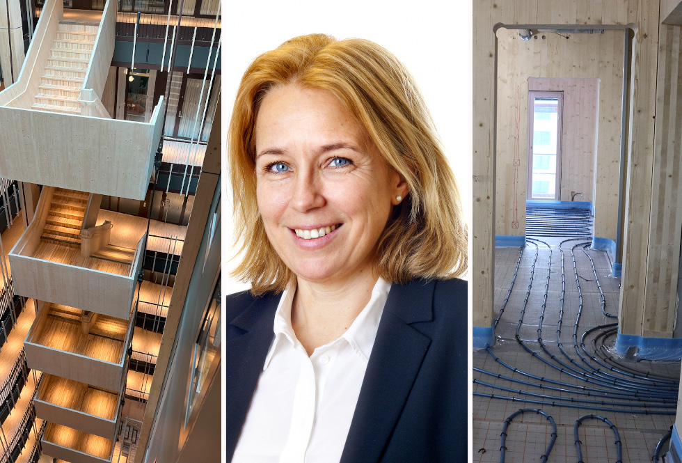 Susanne Rudenstam, kanslichef på Träbyggnadskansliet. Magasin X i Uppsala till vänster och Interiör från Cederhusen under uppbyggnaden till höger. Foto: Samuel Karlsson